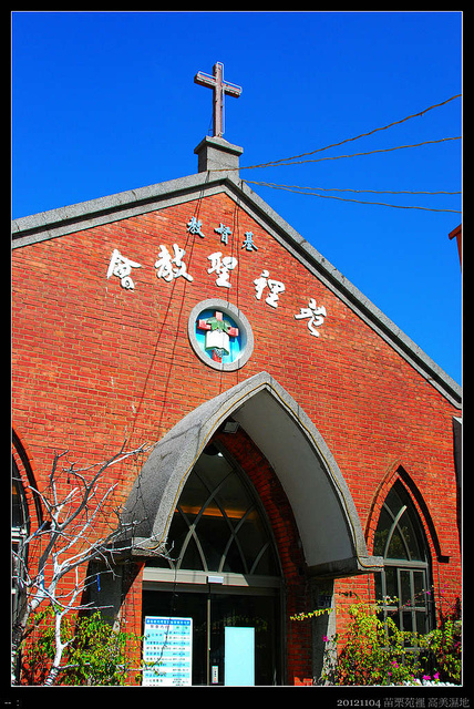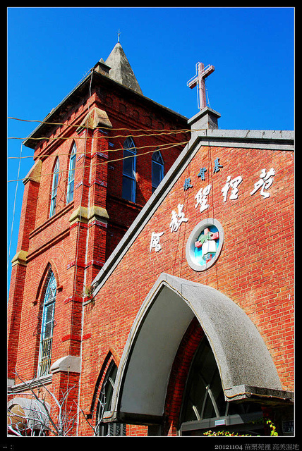 隨興走走,突然看到藍天中突起了一個紅磚十字架尖頂,趕快走過去看看,原來是苑裡聖教會,相機拿起來拍幾張,看來古意的教會其實是建於西元1958年,歷史倒沒有特別久遠,門外的教友招呼我們進去看看,不好意思啊!裡頭還有教會的活動,又不是教友,再者內裝並不特別,就閃了。再者更重要的原因是,我們餓了......