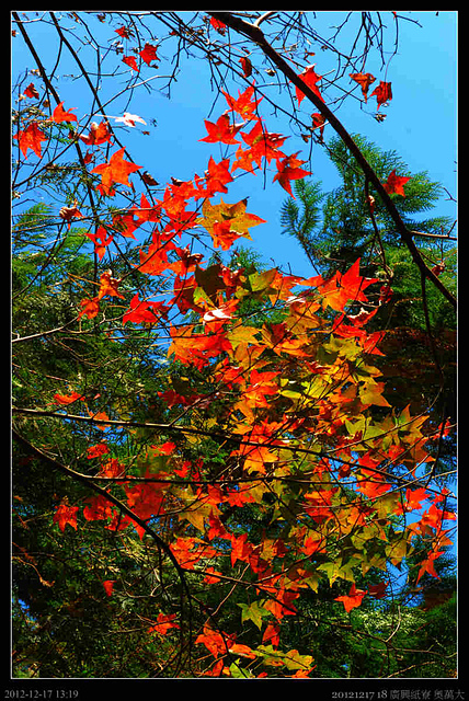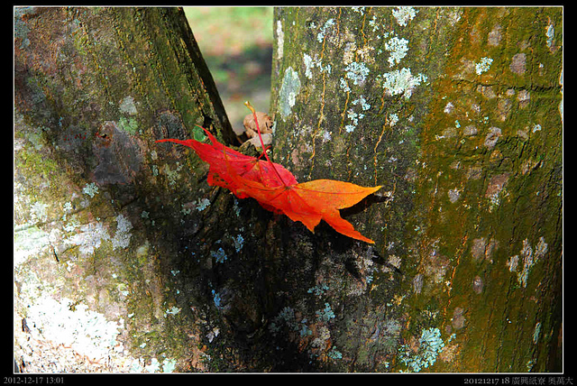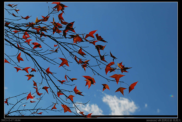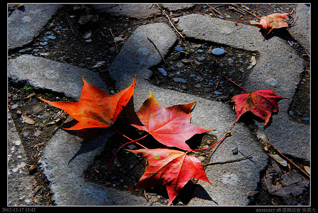 路上開始出發深紅的楓葉,不知道為什麼有些樹葉會在秋冬變為紅色或黃色,或許生物的機制是可以被解釋的?但不曉得為何它要如此?對它的生存有什麼優點?天地間令人好奇或不解的東西太多,愈來愈了解所知太少.....太少...