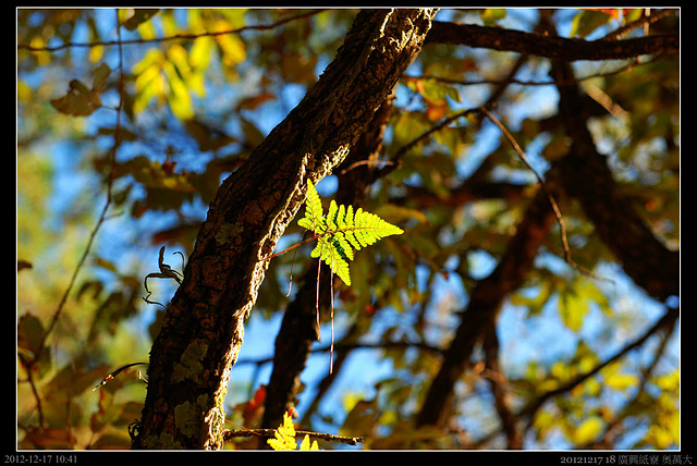粗皮櫟的樹皮間,硬是長了一棵小蕨.....生命力旺盛.....