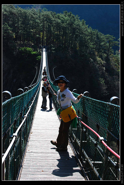 在觀鳥平台上可以看到橫在溪谷上的吊橋,溪谷間的林冠的葉片或綠,或黃,或橙,或紅,像是點描的油畫.....