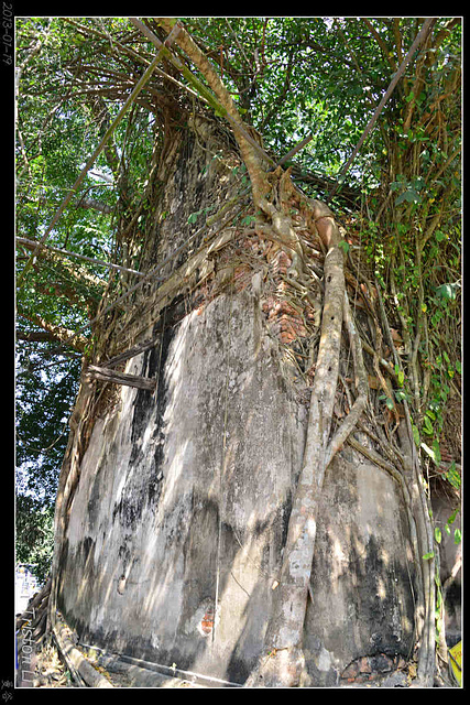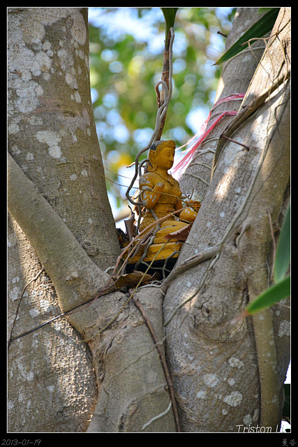這裡叫樹中廟,不是眼前的這座大廟,而是旁邊樹裡的那間樹中廟。廟前有座銅雕,是泰國第三王朝的國王,祂是個華橋,鄭信。西元1765–1767年期間(清朝乾隆年間),緬甸和暹羅發生戰爭,1767年大城王朝首都阿育塔亞(Ayutayya)被緬甸攻落,四個世紀的大城王朝自此滅亡。但隨即緬甸為了應付清朝的入侵而將大軍撤回 (清緬戰爭),1770年,泰國將軍鄭信驅逐了緬甸軍隊,建立了新的王朝—吞武里王朝。1782年,泰國發生宮廷政變,鄭信被殺。從柬埔寨前線率大軍回京的卻克里將軍(拉瑪一世)掌握政權,建立曼谷王朝,就是延續至今的泰國王室,而現任的泰國國王是拉瑪九世。電影"國王與安娜"中,周潤發演的國王是拉瑪四世,安娜的學生就是拉瑪五世(1853年~1910年),名"朱拉隆功",是泰國有名的君主之一。