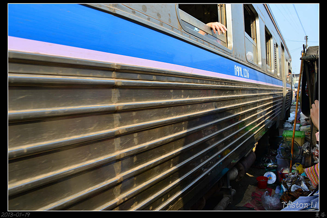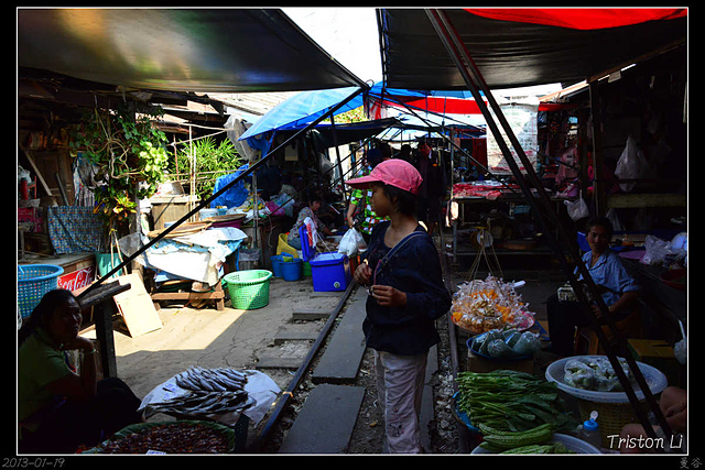 這就是鐵道市場的入口。在鐵道兩旁,擺滿了由旁邊市場所延伸出來的攤販,鐵軌平常就變成了人行步道和市場擺攤的地點,甚至連尼龍布棚都搭起來,如果不是還有每天固定八個班次的火車來回,一定很難想像這裡的應有模樣。如果沒有每日上演的鐵道秀,也就是平常不過的菜市場。