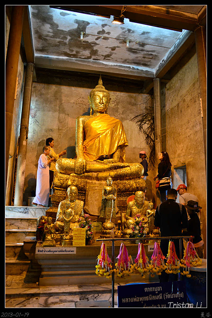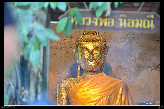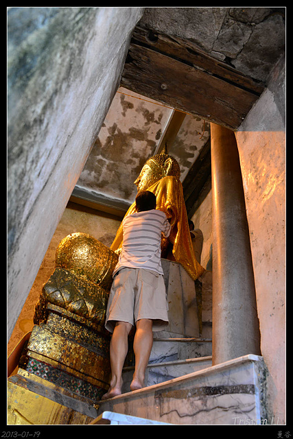 由廟外的小窗剛好可以仰望佛像。泰國人敬拜神佛的方式是向神像上貼金箔。中國人愛往自己臉上貼金,泰國人是愛往神像上貼金。