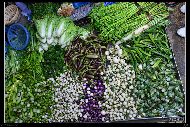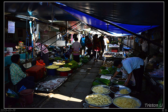 前面驚呼一動,黃色的火車緩緩駛來,注意看那地上的菜的擺放拿捏的多好,車廂幾乎就和攤上的東西,路邊的人擦身,絲毫無損。神乎其技啊!