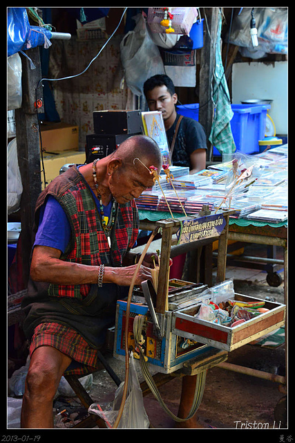 這位捏麵人的阿伯很酷,不顧我相機鏡頭在他的身上來回梭巡,他就是自顧自地吃便當,自顧自地捏著自己的麵人,眼神連瞧我也不瞧,把我當空氣一般。