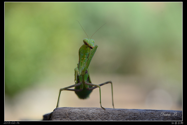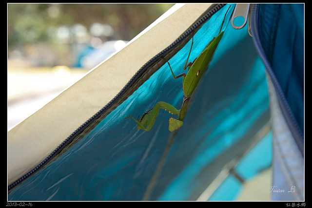 時間差不多哩!這次要好好整理一下營帳,不然下次又不知要何時才會再露營,營帳裡竟然躲了隻大螳螂,可惜我不是另一位朋友,沒辦法捉起來,給牠好好來個生態教學。只能由牠舞舞大鐮刀,再放牠遁入林中。