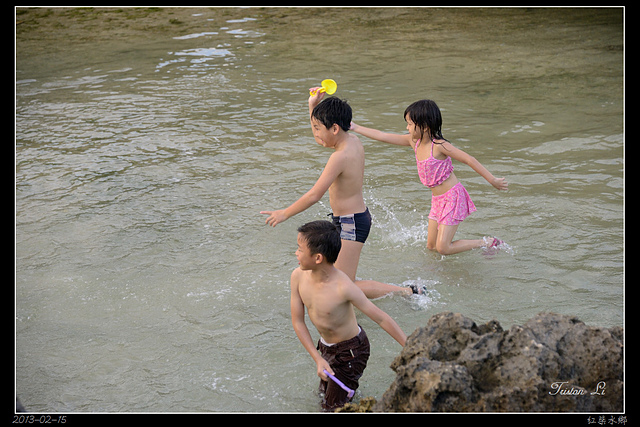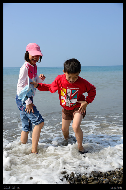 我們沒給小朋友準備泳裝,兒子倒很爽快,上衣一脫,就衝下去,女兒放不開身手,只能挽起褲管,在旁邊潑潑水