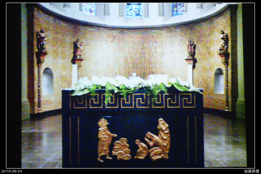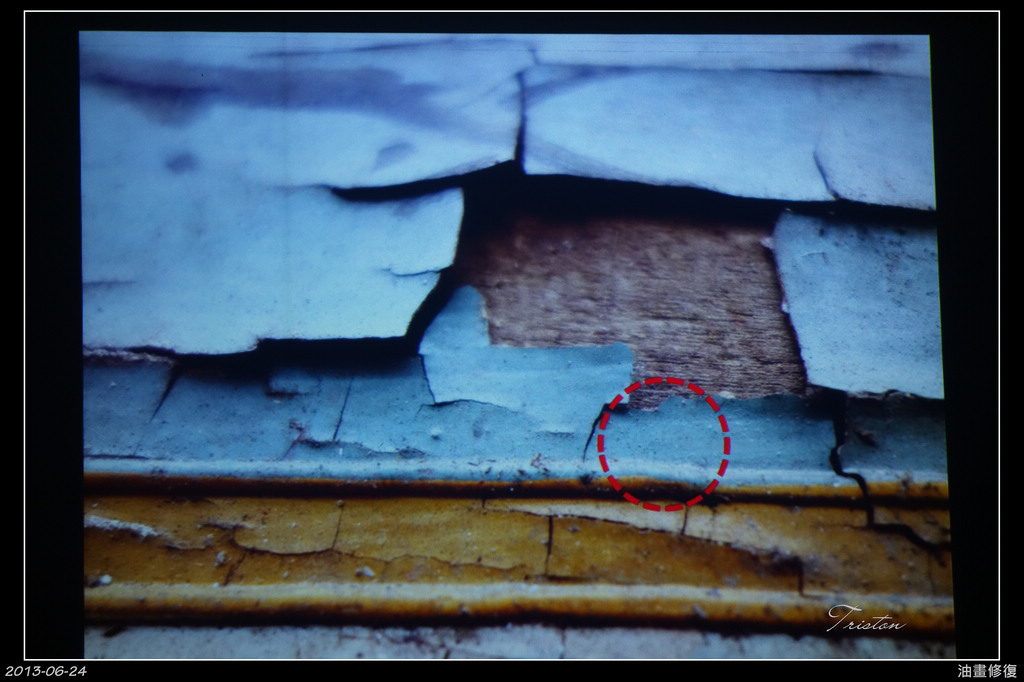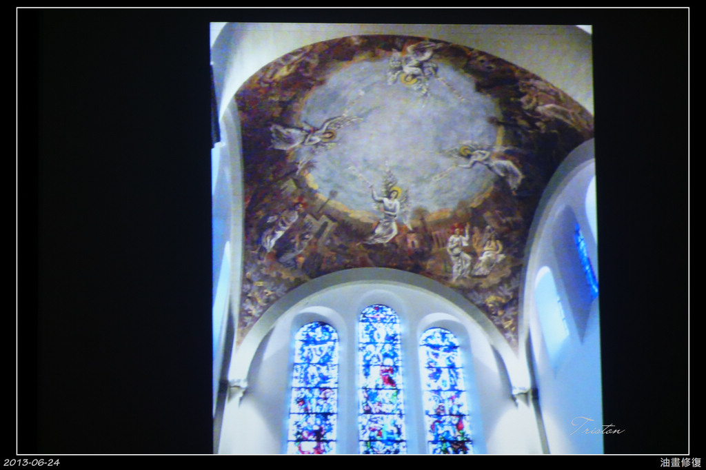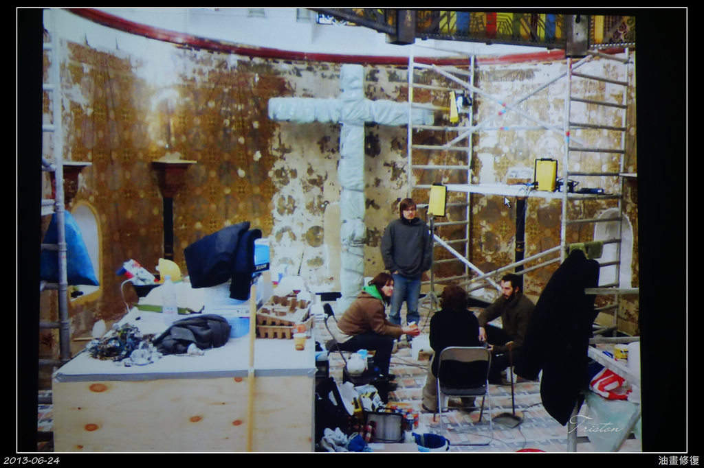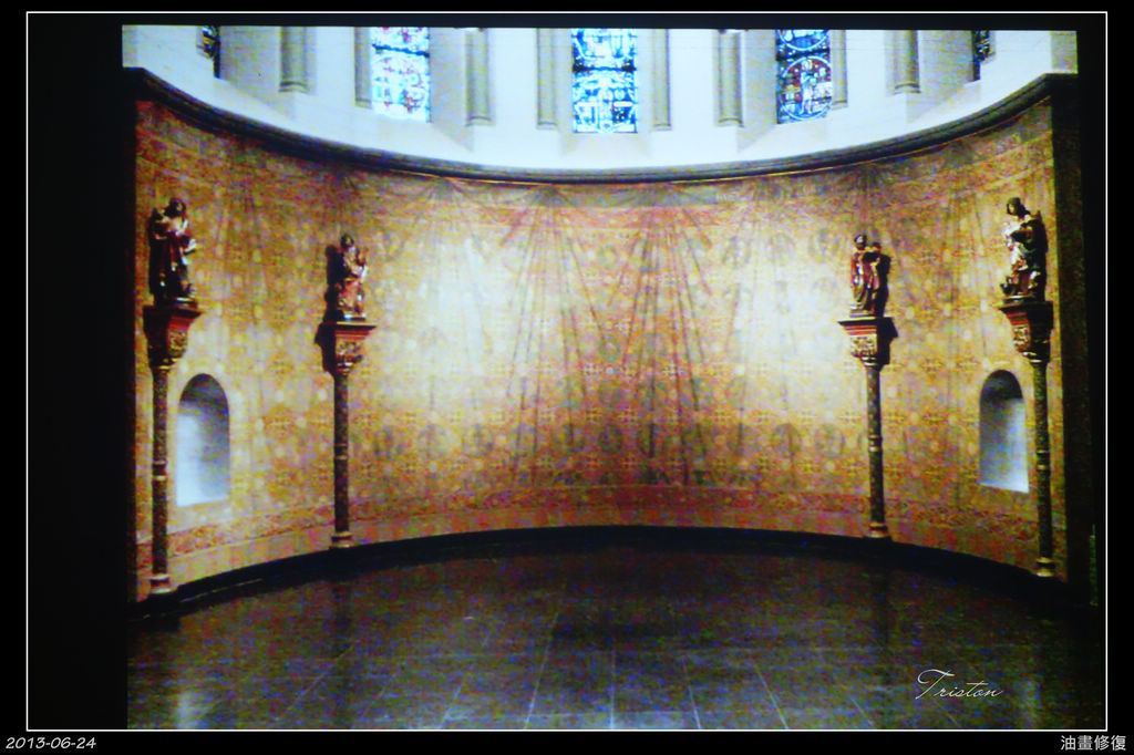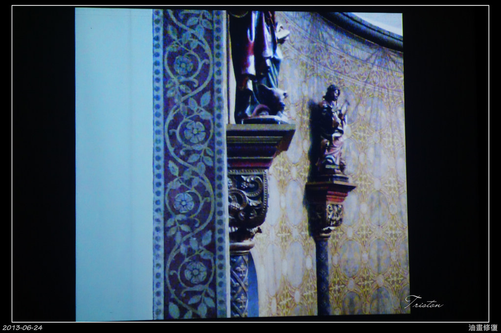 祭壇壁畫修復,要先把歷代主教所上的油漆先去除,又不能傷到內層的原作。